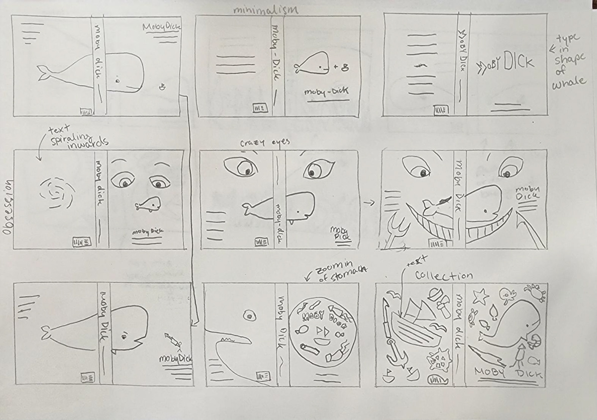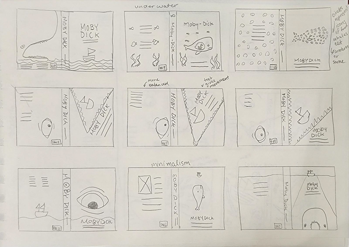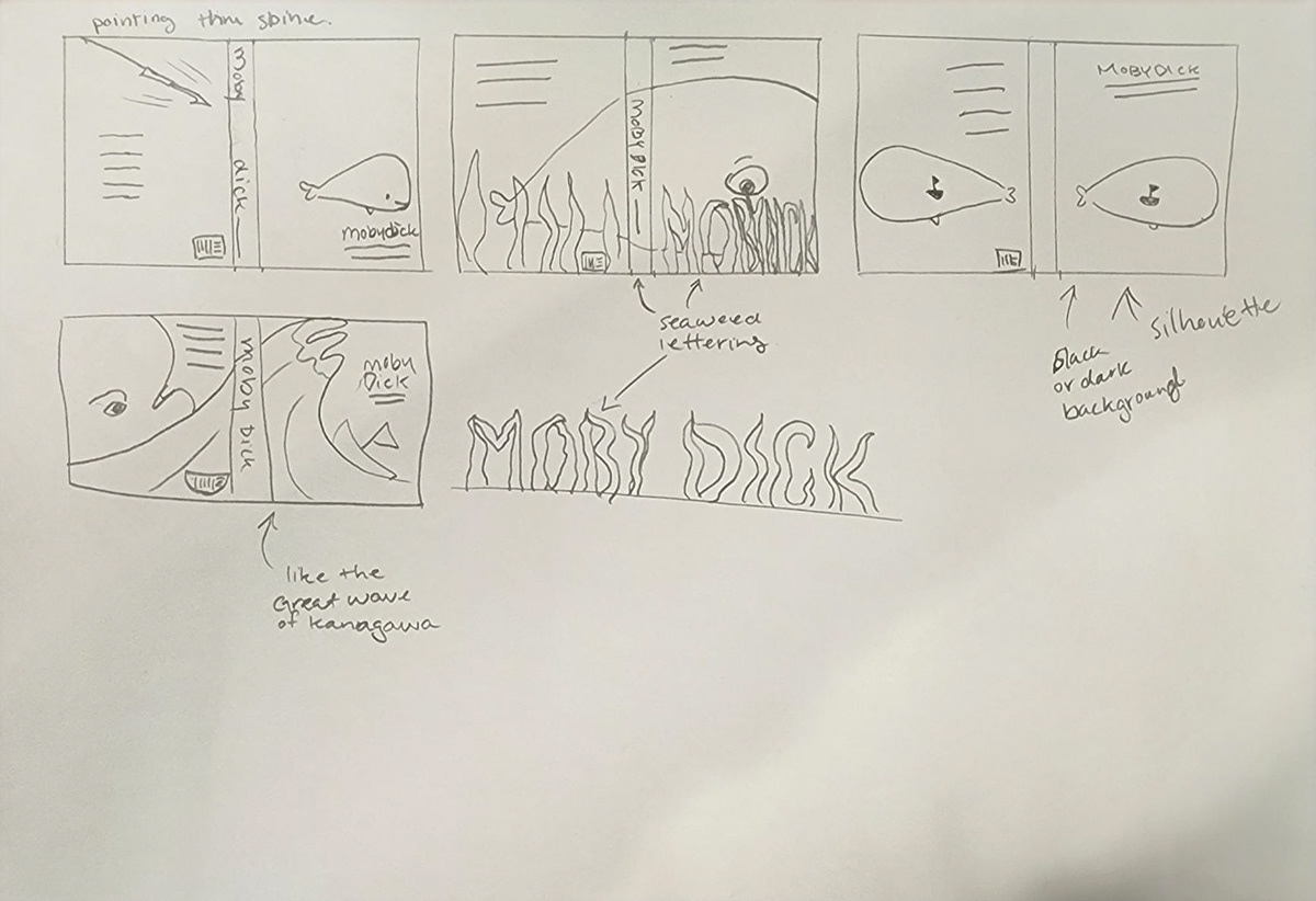 Many of the previous Moby Dick book cover designs I researched have a more serious note to them which may deter some people from wanting to read the book. Therefore, I went with a fun and engaging approach to the book cover in hopes of improving the interest of people who pick up the book. To achieve this approach, I designed the cover so that the front and back can act as standalone designs, but once both are spread the reader will see the design in its full complete form. Requiring the reader to spread both the front and back covers promotes reader engagement, as well as lengthening the amount of time they spend with the book. The longer the reader pays attention to the book, the more memorable it is for them and more likely for them to read the book.